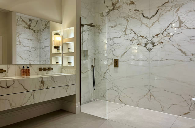Large format tiles were used to provide a sleek and modern look throughout the interior.